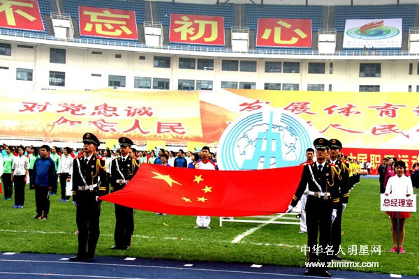 驻新华社武警中队国旗班的战士,手挚巨大鲜艳的五星红旗在新华社第六届职工田径运动会上作为前导进入北京奧林匹克运动场(桑全利摄影)